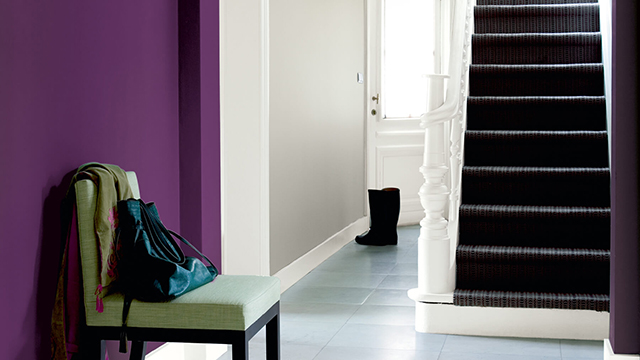 Sử dụng màu sắc tối cho hành lang dài, hẹp với một bức tường đặc trưng trong một sắc thái tương phản như Sage tím xa hoa. Nó sẽ tạo ra một lối vào ấn tượng hơn nữa khi được.